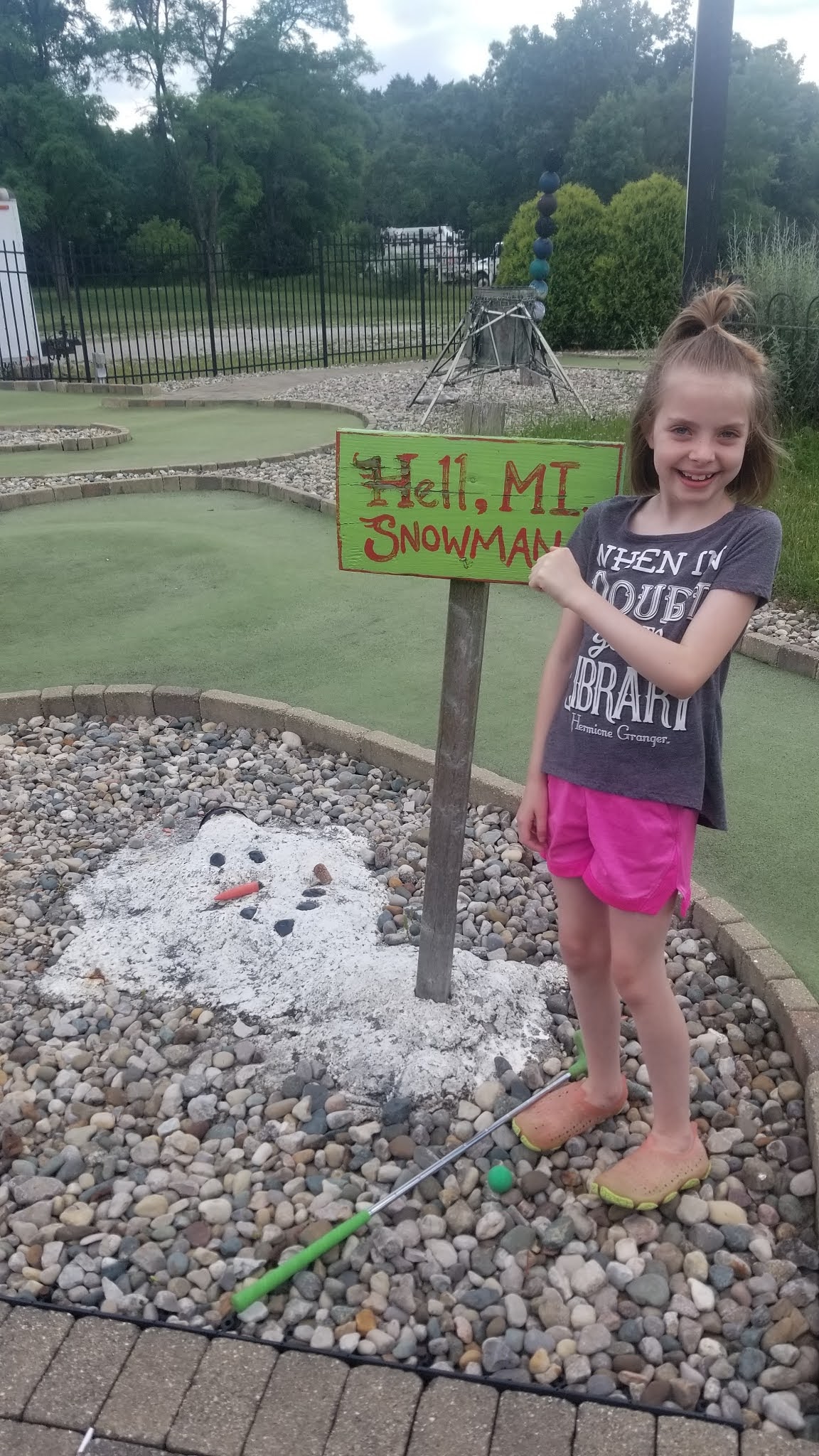 While they were having fun in the lake, the rest of us went to Hell. Hell, Michigan that is. We went there so my mom could get herself another funny t-shirt and so we could do some mini-golfing. The lady there was really nice and let us golf for free. Apparently it's free after 4 and she said "It's 4 o'clock somewhere." It was kind of a run down course but you can't beat free, and the girls had fun cheating, I mean golfing. Afterwards Grams and Poppy bought us all ice cream and the lady was very generous scooping it out. She gave us so much and Penny found a way to smear it all over her face.